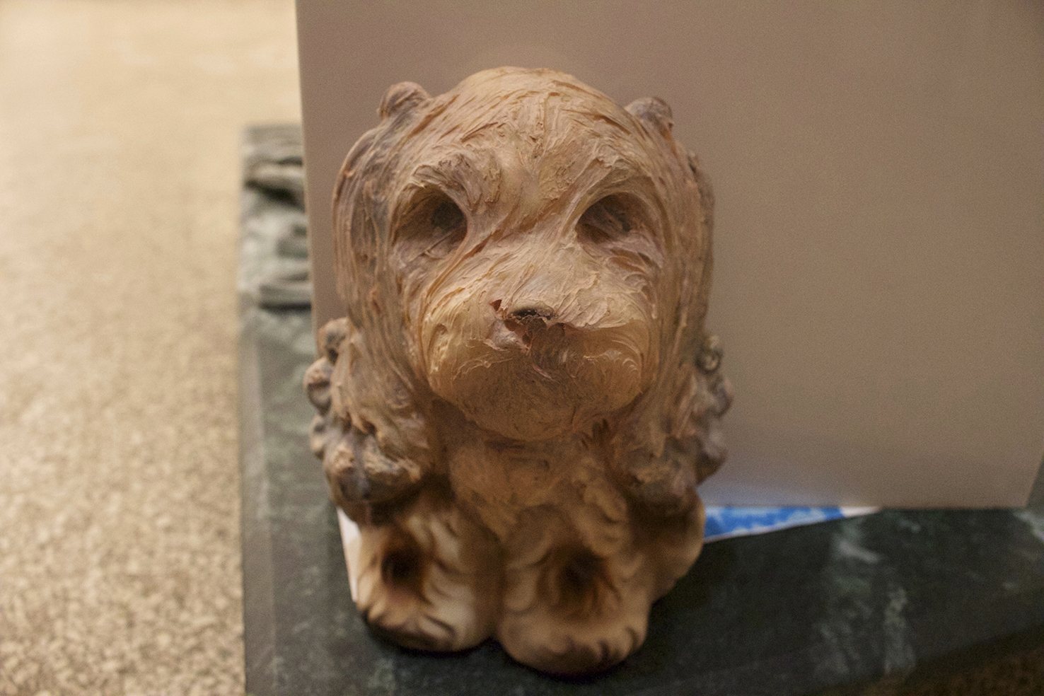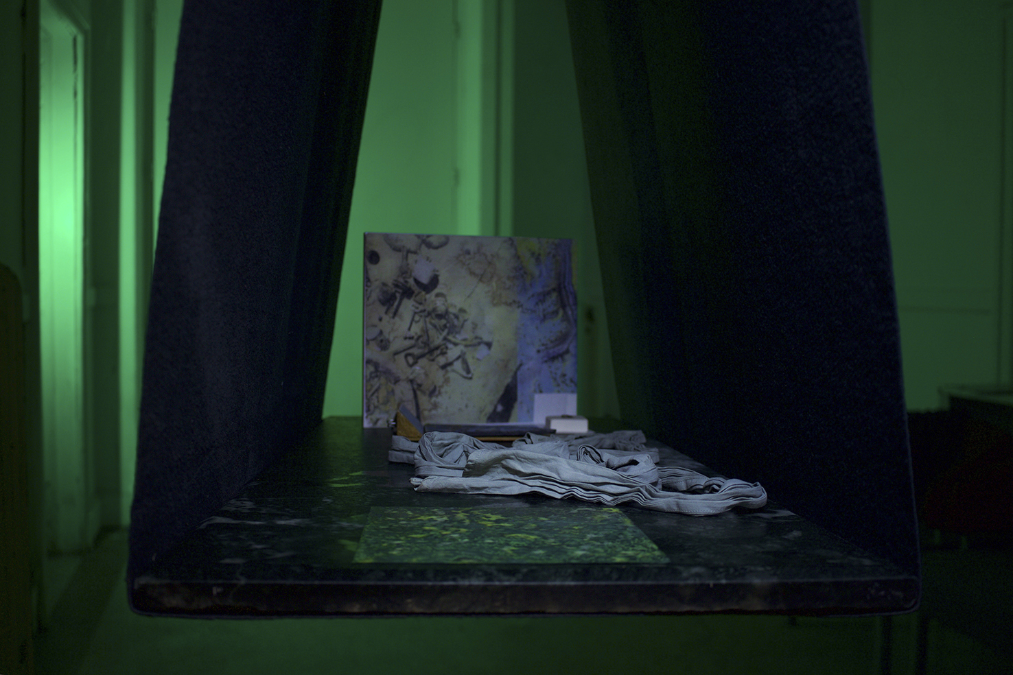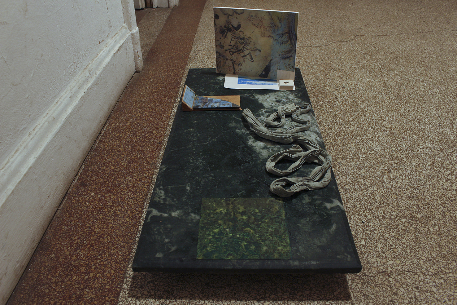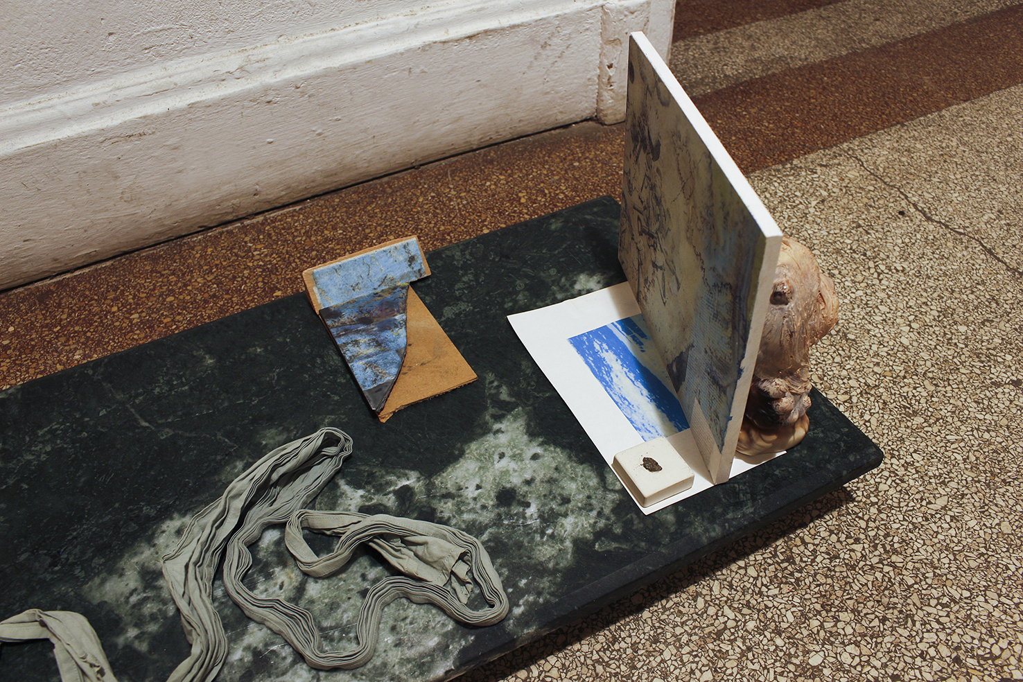 found objects, personal collection of objects and prints, green marble, Nyx skin foundation 'light neutral', Chanel natural finish pressed powder '30 Naturel translucent 2', felt