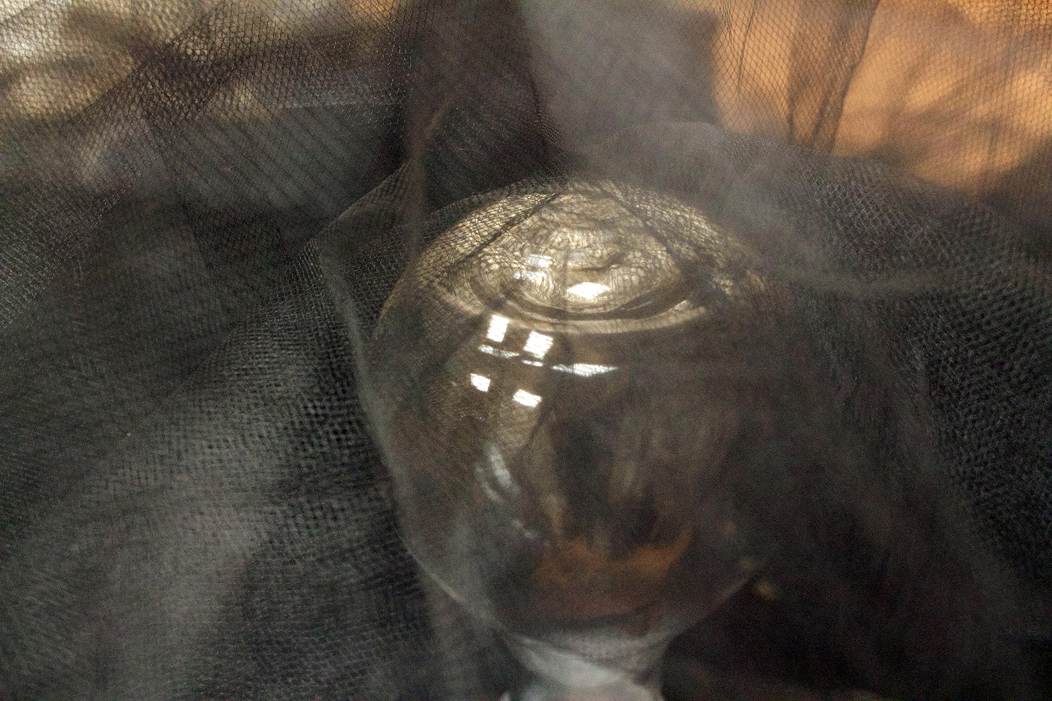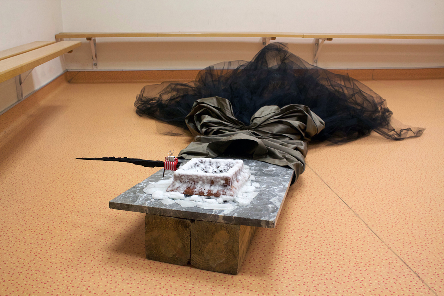gray marble, timber, wild silk and tulle skirt, glass, sugar on ceramic, burnt wood, black paper, silicone, found objects, personal collection of objects
