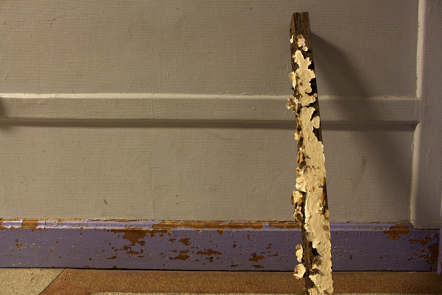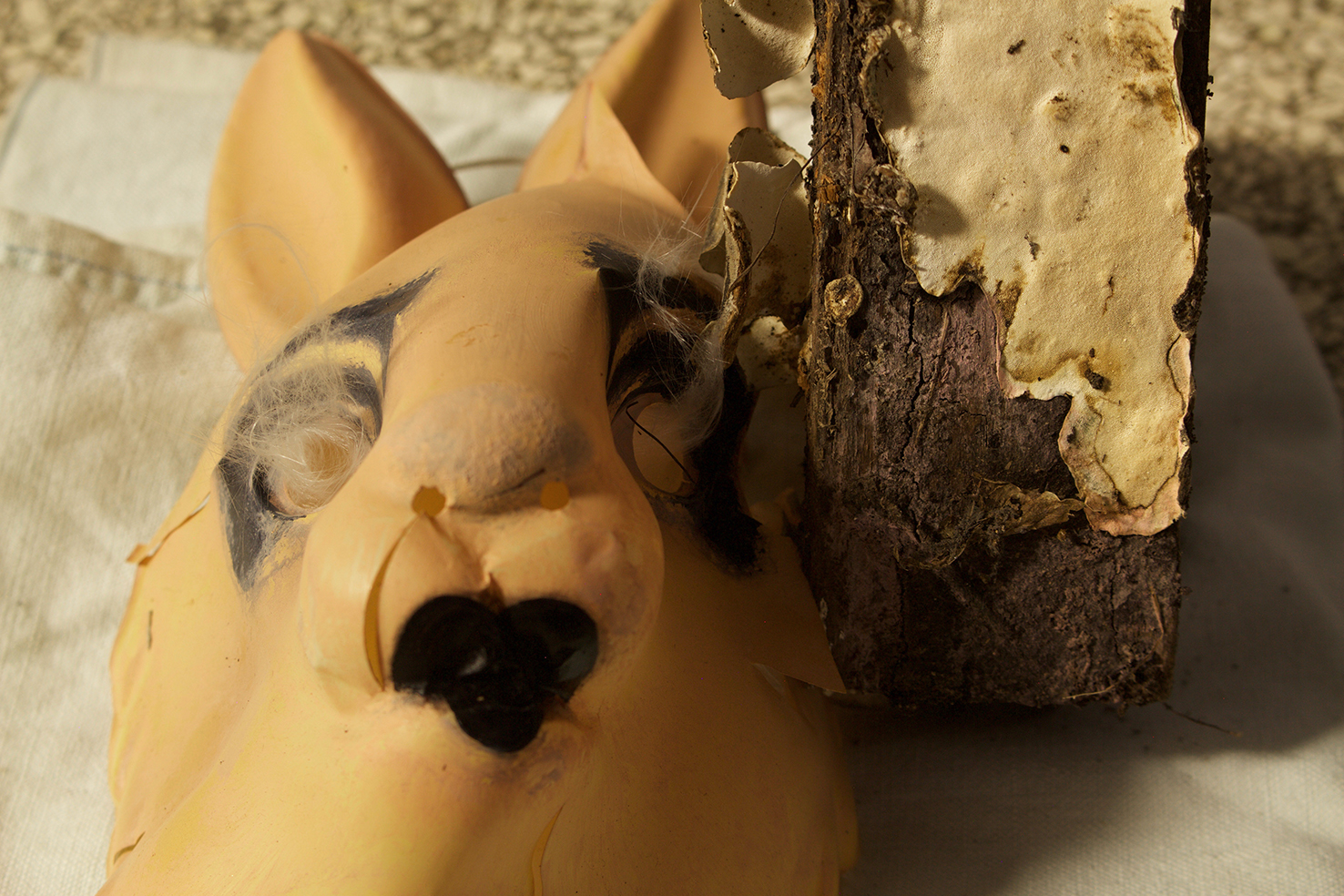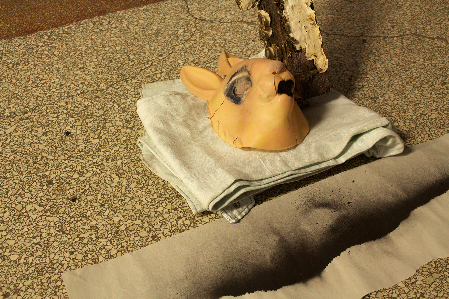 found objects, personal collection of objects and clothes, Nyx skin foundation 'light neutral', Chanel natural finish pressed powder '30 Naturel translucent 2', black ink, black spray paint on newsprint paper, natural white fiber, wood, fungi