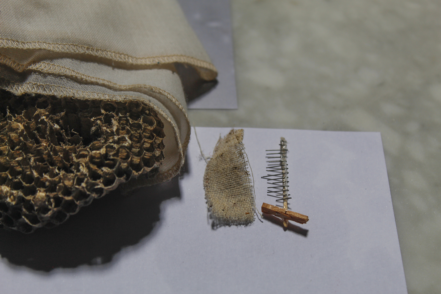 found objects, personal collection of objects, gown, grey marble, vegetal oil on printed paper, leather, wasp nest, fence equipment