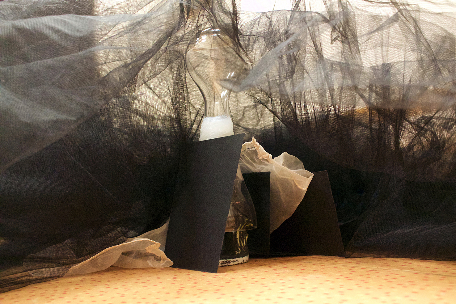 gray marble, timber, wild silk and tulle skirt, glass, sugar on ceramic, burnt wood, black paper, silicone, found objects, personal collection of objects