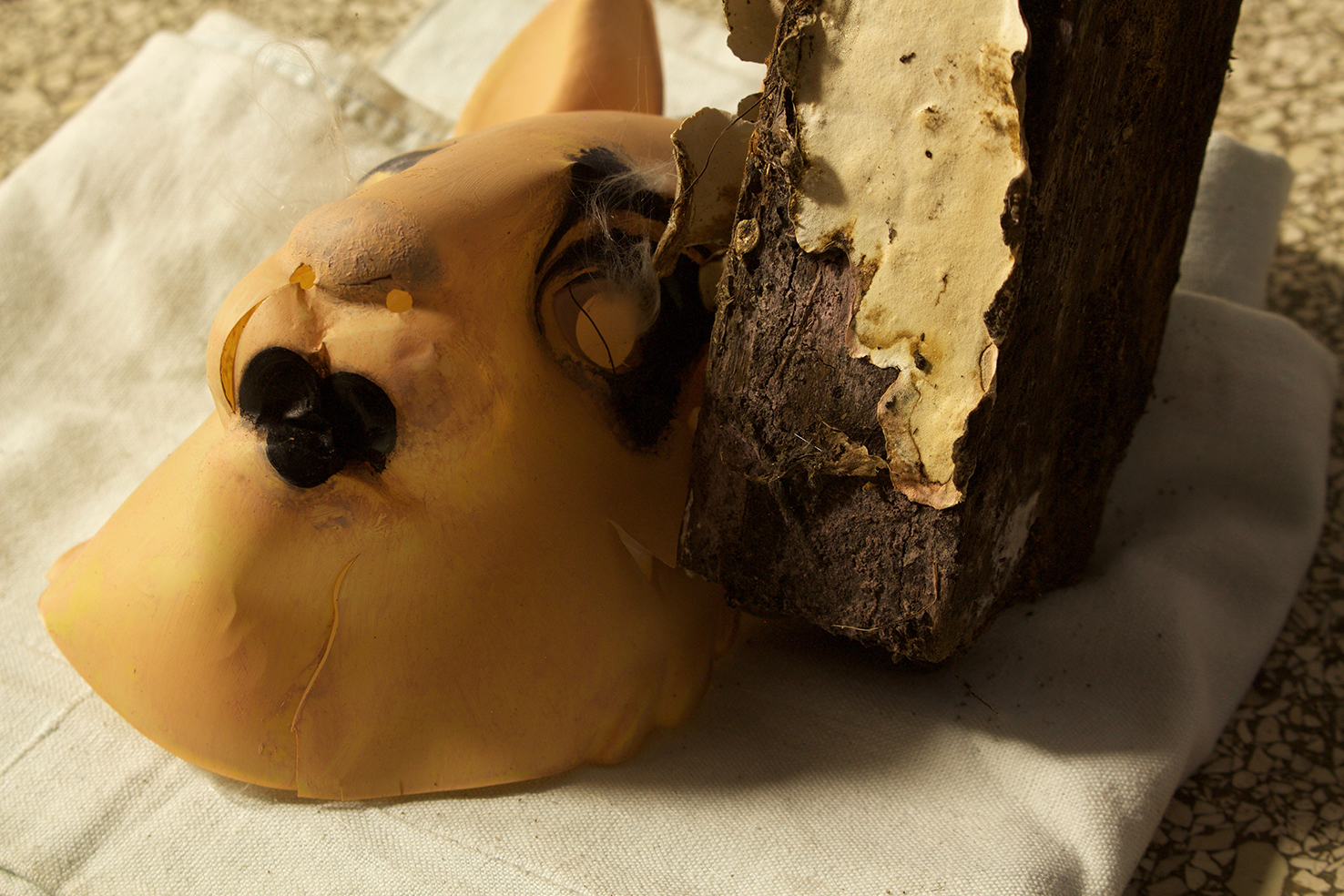 found objects, personal collection of objects and clothes, Nyx skin foundation 'light neutral', Chanel natural finish pressed powder '30 Naturel translucent 2', black ink, black spray paint on newsprint paper, natural white fiber, wood, fungi